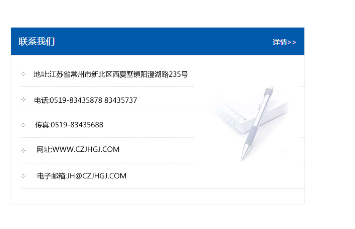 地址:常州市新北區友邦商務大廈1幢16、17層  電話:0519-85101652  傳真:0519-85112595  郵編:213022  網址:www_cz-jiayue_cn.yunmentun.com  郵箱:xiajifengaa@163.com